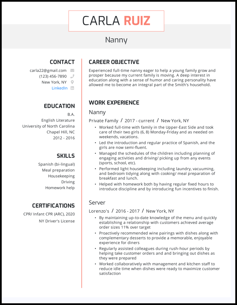 How To Put Nanny On Resume : Currículos profesionales · creador de cv gratis. What is a good description for a nanny? See the nanny bio examples below. The online resume builder so easy to use, the resumes write themselves. A resume objective does the same by showing passion, even if you lack experience. Create a professional resume in just 15 minutes, easy